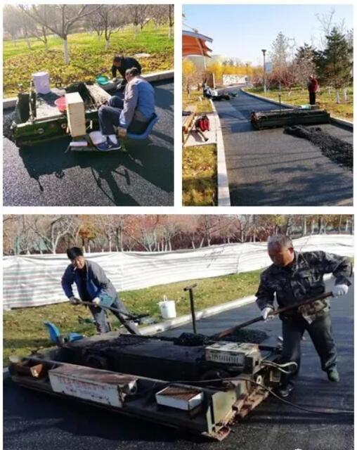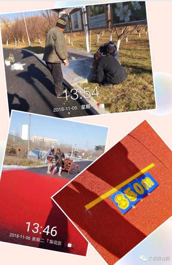10月20日,原料進(jìn)場(chǎng),施工用膠(聚氨酯)及黑顆粒(橡膠)均符合國家環(huán)保標(biāo)準(zhǔn)。次日,塑膠跑道鋪裝工作正式開始。為保證跑道的整體質(zhì)量,施工現(xiàn)場(chǎng)不允許踩踏,這對(duì)于一個(gè)開放式公園頗有難度,施工方配合梨花園管理所在機(jī)器進(jìn)場(chǎng)后第一時(shí)間將梨花園大小共8處出入口全部用擋板封閉,園內(nèi)主要綠地用彩條布加以圍擋,在不同位置分別張貼施工公告。梨花園管理所錄制音頻利用園內(nèi)廣播循環(huán)播放,提醒游人封園期限、施工原因及內(nèi)容,方便園區(qū)管理的同時(shí),也得到了游客的理解和配合。