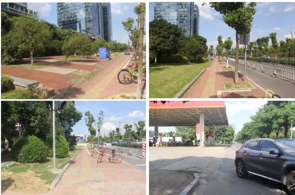 相比艾溪湖北路南側(cè)綠道,置身鬧市的紫陽大道北側(cè)段綠道則面臨著較為局促的發(fā)揮空間。該道路同為南昌高新區(qū)主干道之一,道路環(huán)境則較為復(fù)雜,綠道與大量橫向市政道路和單位出入口相交,路段沿線有大小路口25個(gè)之多。