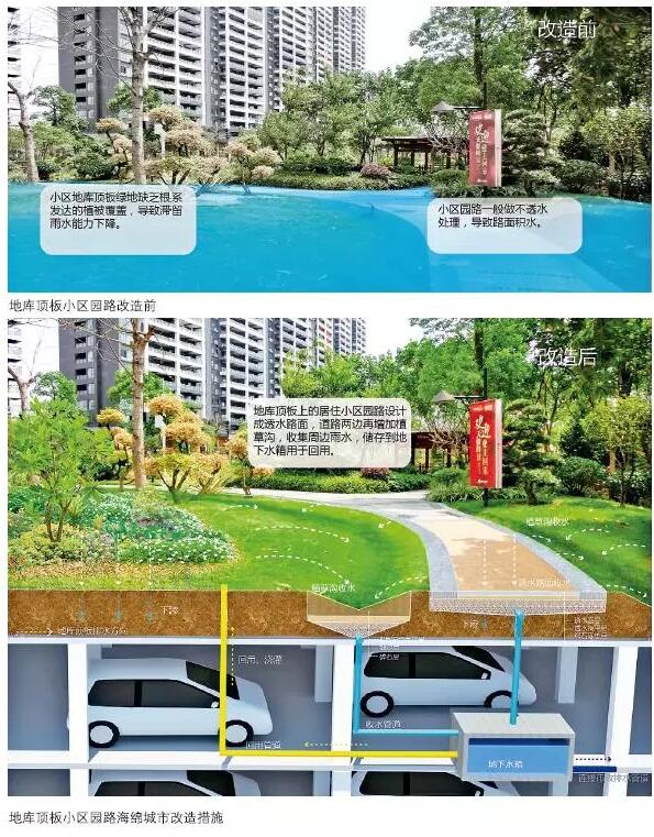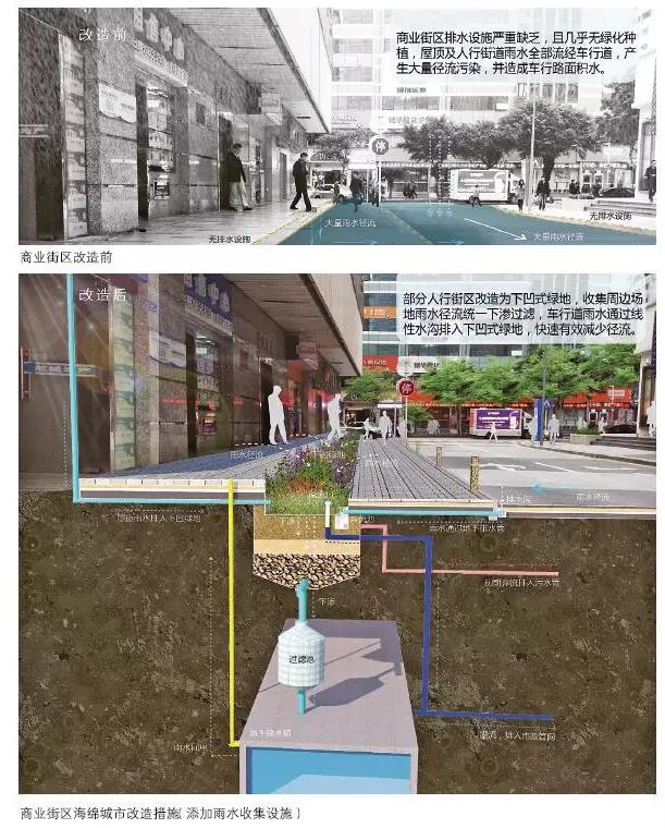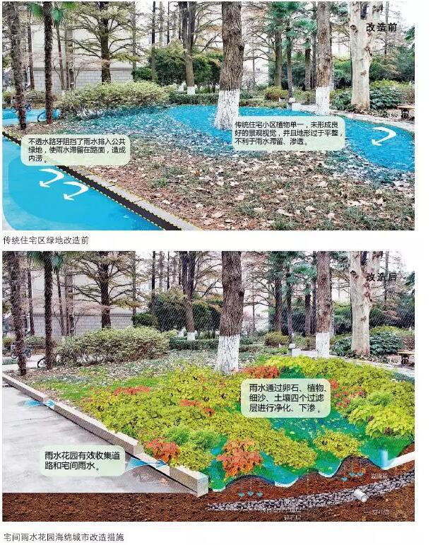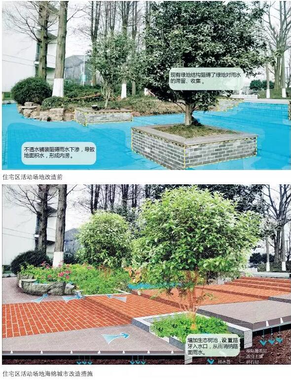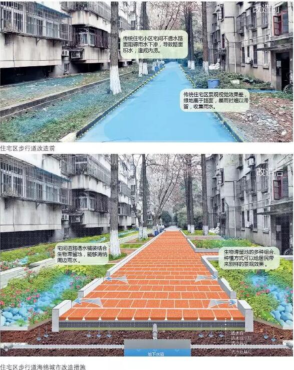 傳統(tǒng)住宅區(qū)中的宅間道路和綠化帶可以改造成透水路面和生物滯留池,用來收集道路上的雨水,避免路面雨水沉積對居民生活造成影響。