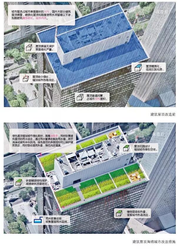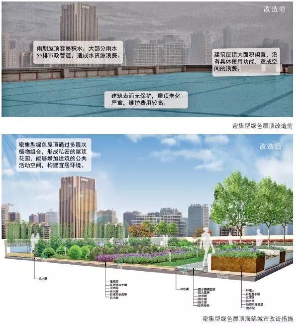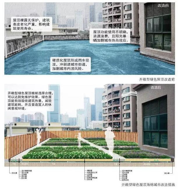 雨洪來臨時,建筑屋頂產(chǎn)生的徑流是導致城市內(nèi)澇的重要原因之一。因此,將城市的建筑屋頂改造為綠色屋頂能有效緩解城市雨水徑流壓力。一方面,通過海綿城市結構來收集、儲存雨水,并利用雨水進行澆灌,可以節(jié)省各種能耗;另一方面,綠色屋頂將形成良好的城市景觀,提升城市的整體綠化率。