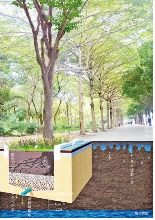 樹池的標高一般比路面低一些,用以收集、初步過濾雨水徑流。就行道樹而言,一系列連貫的樹池可以被設計成潛在的收水裝置,最大限度地發(fā)揮收集、過濾雨水徑流的作用。
