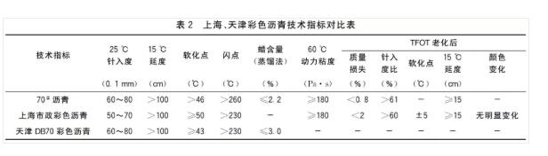 彩色透水瀝青技術(shù)在我國(guó)應(yīng)用之初,由于造價(jià)高,技術(shù)不成熟,因此并沒有形成系統(tǒng)的規(guī)范化要求。各地區(qū)根據(jù)當(dāng)?shù)夭噬杆疄r青的應(yīng)用范圍和使用要求,結(jié)合地理環(huán)境因素,制定了相應(yīng)的地方標(biāo)準(zhǔn)。在這些地方標(biāo)準(zhǔn)的制定中,彩色透水瀝青的評(píng)價(jià)指標(biāo)參照國(guó)外經(jīng)驗(yàn),基本上都以普通路用瀝青性能指標(biāo)為基礎(chǔ),結(jié)合實(shí)際工程經(jīng)驗(yàn),確定指標(biāo)范圍。以上海和天津兩地對(duì)彩色透水瀝青的評(píng)價(jià)指標(biāo)為例,對(duì)比70#基質(zhì)瀝青,如表2所示。