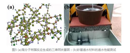 結(jié)構(gòu)決定性能,性能決定用途,所以從砂基透水材料的結(jié)構(gòu)和組成來看。砂基透水路面是利用高分子樹脂(如圖5(a))作為粘合劑,均勻的包裹在沙粒的表面,利用樹脂膠自身的特性,通過其自身的化學(xué)反應(yīng)生成大量三維網(wǎng)狀的親水性基團(tuán),從而實(shí)現(xiàn)破壞水的表面張力,賦予其極強(qiáng)的排水、濾水功能。