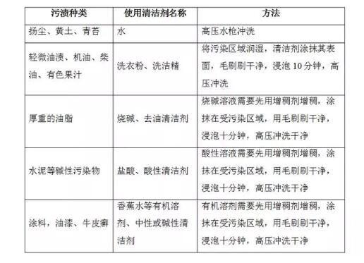 由于底層透水混凝土是堿性的,因此不宜采用酸性過強(qiáng)的清洗劑,宜采用中性或堿性的清洗劑。對(duì)表面因水泥等堿性硬化物造成污染的,也可以采用鹽酸清洗, 但清洗后需盡快沖洗表面干凈,減少酸性在底層混凝土上的停留時(shí)間。