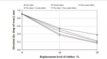 有研究指出加入橡膠的透水混凝土表現(xiàn)出優(yōu)良的耐磨性能,如圖5所示。由圖5可以看出,增大橡膠摻量可以系統(tǒng)的提高透水混凝土的耐磨性能,這可能是因?yàn)槔w維持有橡膠的能力可以保證水泥的完整性,這種完整性有利于透水混凝土的抗磨性能[25],表面骨料不容易因?yàn)槟p剝落。
