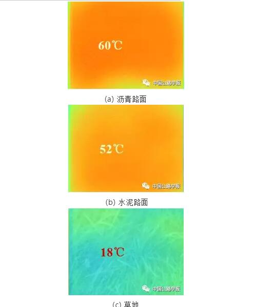 常規(guī)的路面材料熱容小、吸熱快,在太陽輻射下,升溫迅速,是城市熱島效應(yīng)日益加劇的主要原因,圖4所示為夏季城市不同下墊面紅外熱成像溫度。