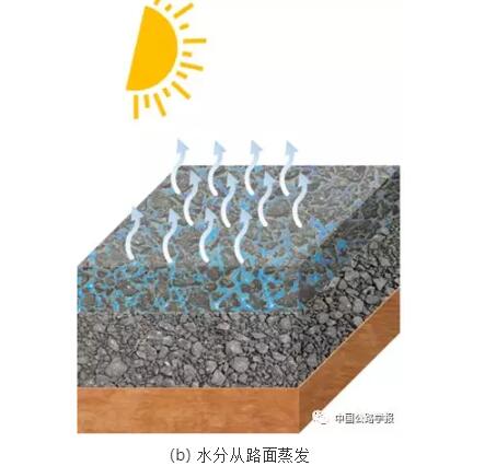 可以通過改變路面材料的熱物理性質(zhì)和路面與環(huán)境的熱交換方式,從而得到具有降溫功能的路面。具體的實(shí)現(xiàn)途徑為,以多孔路面材料為基體,在其孔隙中灌注吸水保水性材料,這種材料具有較好的吸水和保水能力(圖5)。在雨天或者灑水時(shí),能夠吸收水分,當(dāng)環(huán)境溫度較高時(shí),利用路面材料中持有的水分蒸發(fā)來降低路面溫度,減弱熱量在瀝青路面中的積累,改善瀝青路面的熱輻射效應(yīng),可以降低路表和路域的環(huán)境溫度,為道路周圍的的行人和行車提供舒適的環(huán)境,從而起到緩解城市“熱島效應(yīng)”作用。其實(shí)現(xiàn)原理如圖6所示。