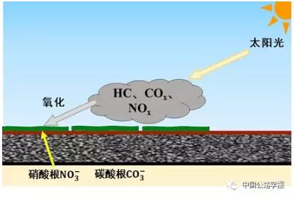 路面材料是汽車尾氣的直接承受者,若能夠?qū)呐艢夤艿琅懦龅钠囄矚鈨艋蓪?duì)人體無害的物質(zhì),將會(huì)有效的減少空氣污染。其實(shí)現(xiàn)路徑可以通過在路面材料表面涂刷光催化涂料,在日光或可見光的照射下,通過把光能轉(zhuǎn)化為化學(xué)能,將汽車尾氣中的主要污染物質(zhì)碳氧化物和氮氧化物污染物催化氧化為無害物質(zhì)。這種光催化涂料在雨水或人工灑水的作用下,能夠活化再生,重復(fù)使用,圖7所示為路面材料分解尾氣的技術(shù)路徑。