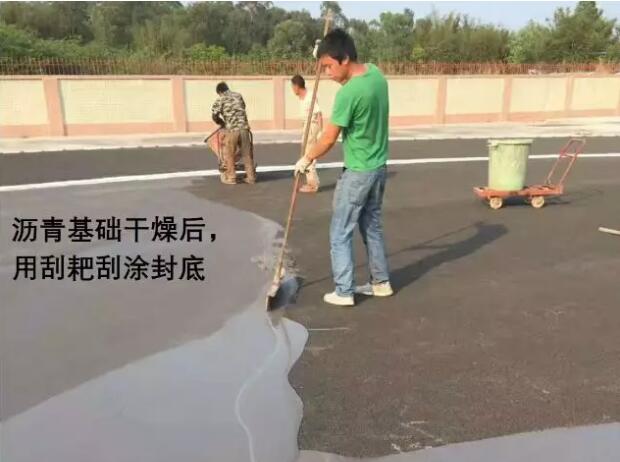 現(xiàn)場(chǎng)調(diào)料:丙烯酸乳液50KG,水泥兩包,80目石英砂3包,108膠水25公斤,加適量水,混合攪拌均勻,倒入施工現(xiàn)場(chǎng),用刮耙將漿液均勻刮涂再場(chǎng)地地面(基礎(chǔ))上,需掛涂2-3遍,待其干固4小時(shí),每一道施工完,干固后打磨平整,再用自來(lái)水試水平,積水處再配底涂混合料補(bǔ)平,直到符合積水率要求。