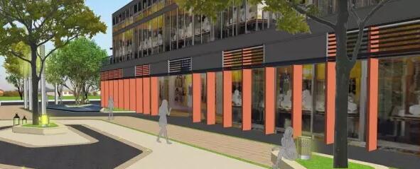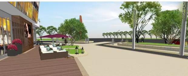 售樓部內(nèi)側(cè)以透水混凝土為主的內(nèi)街街景效果圖——深灰色透水混凝土+米黃色透水混凝土+黃色石材鋪裝與建筑外立面色彩形成豐富的色彩界面