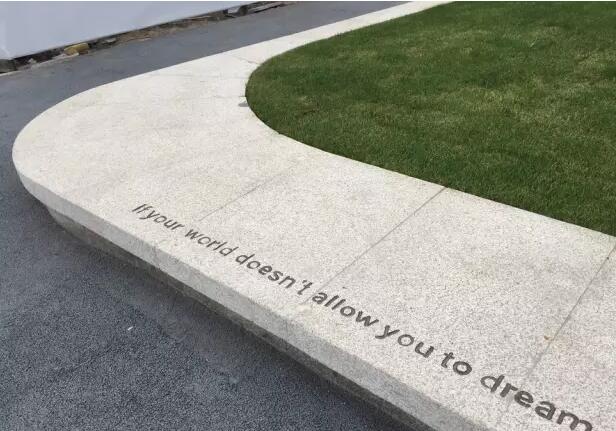 實(shí)景圖,黑色、米色透水混凝土色調(diào)對比強(qiáng)烈,引導(dǎo)性強(qiáng),草縫、鑲嵌文字等細(xì)節(jié)的呈現(xiàn),使場地更具品質(zhì)感