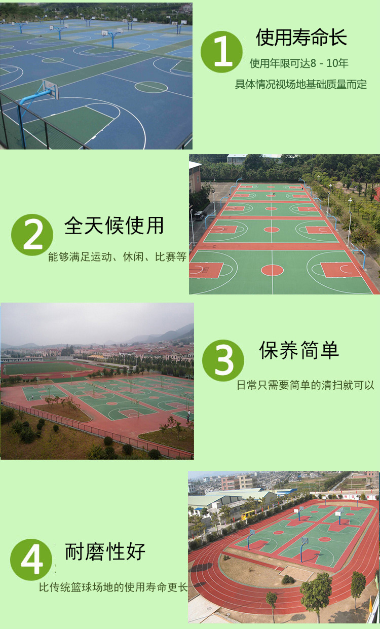 3、丙烯酸籃球場使用壽命長,使用年限可達(dá)8-10年(具體情況視場地基礎(chǔ)質(zhì)量及施工質(zhì)量而定);