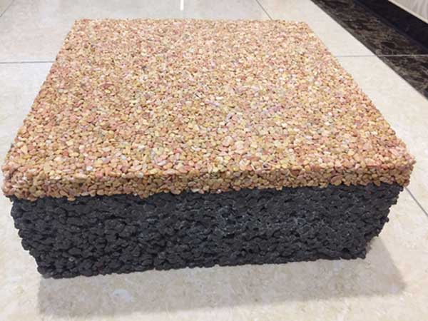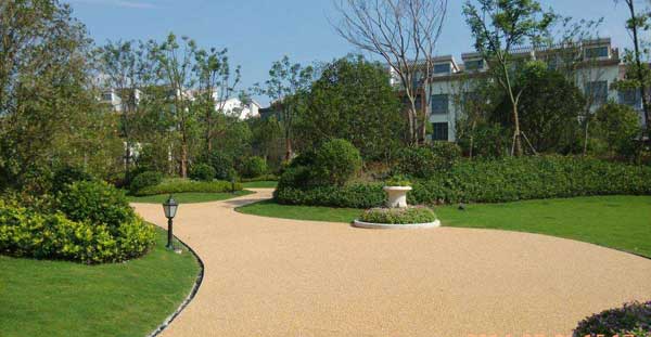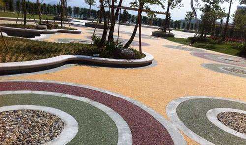 傳統(tǒng)的透水混凝土是由水泥、石子、膠結(jié)劑組成的材料,主要目的是能夠達到透氣透水的效果,較多應(yīng)用于人行道和園林綠道,由于傳統(tǒng)的透水混凝土最終仍然和水泥路面一樣的灰色,所以不能滿足對審美需求較高的人群,即使能夠?qū)ν杆炷吝M行染色,但染色畢竟不能夠持久鮮艷,因此業(yè)內(nèi)人士研究了膠粘石透水地坪。直接使用透明的有機樹脂(膠結(jié)劑)把通過人工篩選的精美天然石子粘結(jié)起來鋪裝在地面上。由于膠結(jié)劑是透明的,所以形成的膠粘石地面就像把石子隨意自然的攤鋪在地上一樣,粒粒清晰可見,而又不會因受到壓力或摩擦而松散,更不會掉色,雨水通過膠粘石地面時也能清楚的看清水是如何被“吸”到地下。