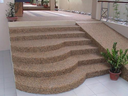 一般分為兩種做法,室外需要較高承載力要求的場地,先鋪裝足夠承載厚度的普通透水混凝土,再鋪裝1-3CM的膠粘石,這樣的做法不僅保證了足夠的承載力,同時使表面美觀自然,更重要的是大大的節(jié)約了成本,因為天然的石子是非常昂貴的。而室內(nèi)或其他用于裝飾對承載要求不高的可直接鋪裝1-3CM的膠粘石,如游泳池旁、洗浴中心等,不僅裝飾了地面,同時時地面永無積水,大大的降低了滑倒事件的發(fā)生。