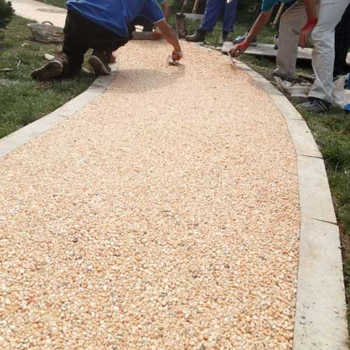 具體操作:按照嚴格標(biāo)準(zhǔn)的比例將雙組份樹脂膠均勻攪拌預(yù)熟化10-20分鐘,然后按比例將天然石子和膠結(jié)劑攪拌均勻,最后攤鋪在需要使用的地面上,攤鋪完及時使用涂有脫模機的工具壓平抹光,直至整個面層均勻平整。