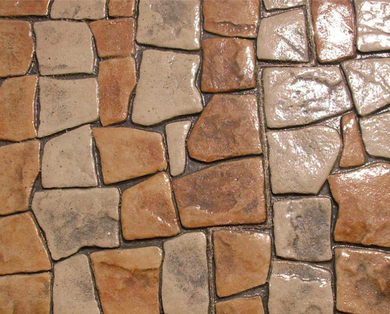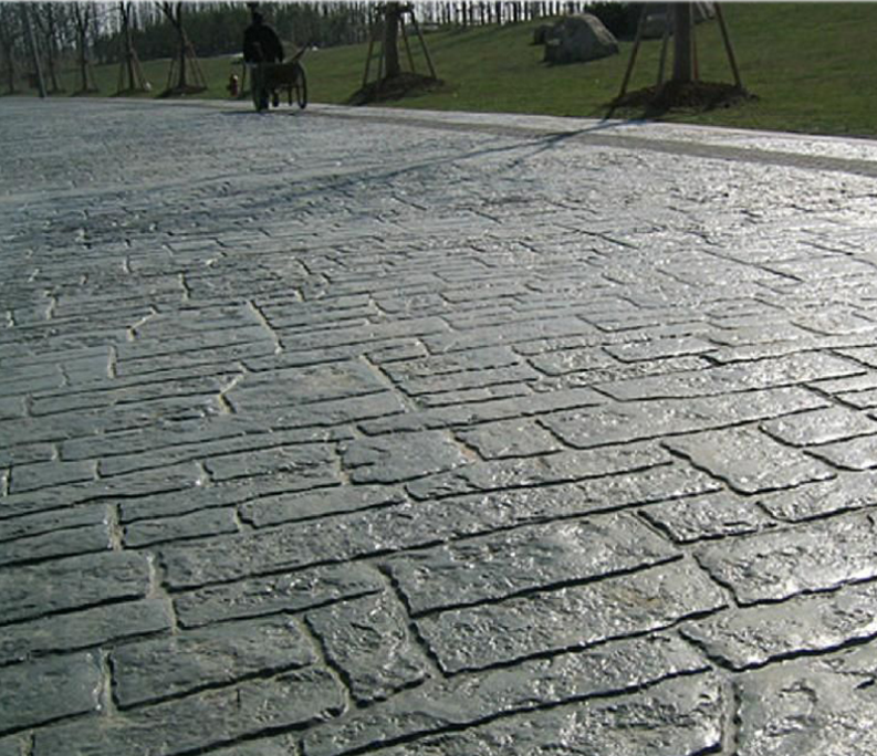 仿石壓模地坪是在新鋪裝的水泥混凝土的基面上找平后(未完全凝固前)使用模具壓印形成各種形狀的紋路,再經(jīng)過表面抹光與噴涂處理等施工工藝,使水泥混凝土表面形成仿真度極高的石材紋理和立體效果。如:大理石、花崗石、自然石等效果。仿石壓模主要材料:混凝土強(qiáng)化料,脫膜粉,保護(hù)劑,顏料等。